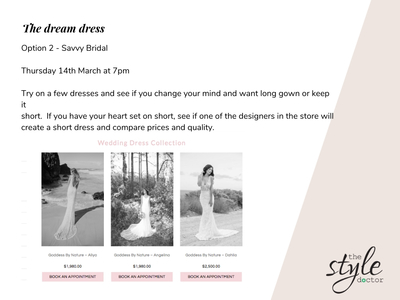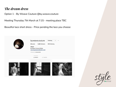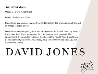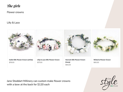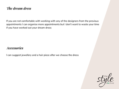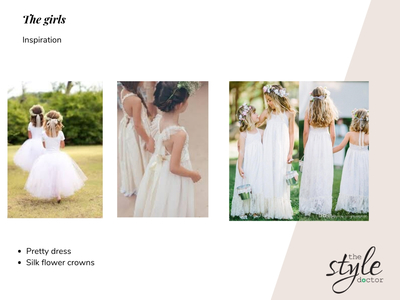 I started with having a coffee with Ellie to get an idea of when and where her wedding was booked which helped to get an idea of the dress code and styling. I also talked about the styles she had in mind for her dress which helped me work out who a good designer would be for her to work with. I also talked about her bridal party which were all the kids and of course the groom.